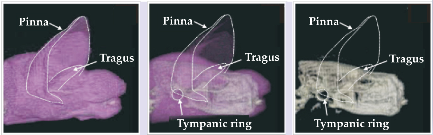 Figure 5. Bat hearing. These three computer tomography scans illustrate the big brown bat’s external ear, including the protective tragus, as a horn-line receiving antenna for funneling sound down to the tympanic ring, or eardrum.