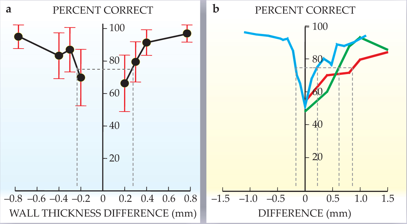 Figure 6. Fine discrimination. (a) A change of less than 0.3 mm in wall thickness allows a dolphin to choose between a standard and comparison aluminum cylinder. In the experiments summarized here, all cylinders had an outside diameter of 3.81 cm and the standard cylinder’s thickness was 6.35 mm. (b) The green and red curves show the ability of big brown bats to discriminate between two holes as a function of difference in hole depth. The blue curve shows the ability of the Indian false vampire bat to distinguish between slightly different highlight echo delays from electronically generated two-wavefront pulses.