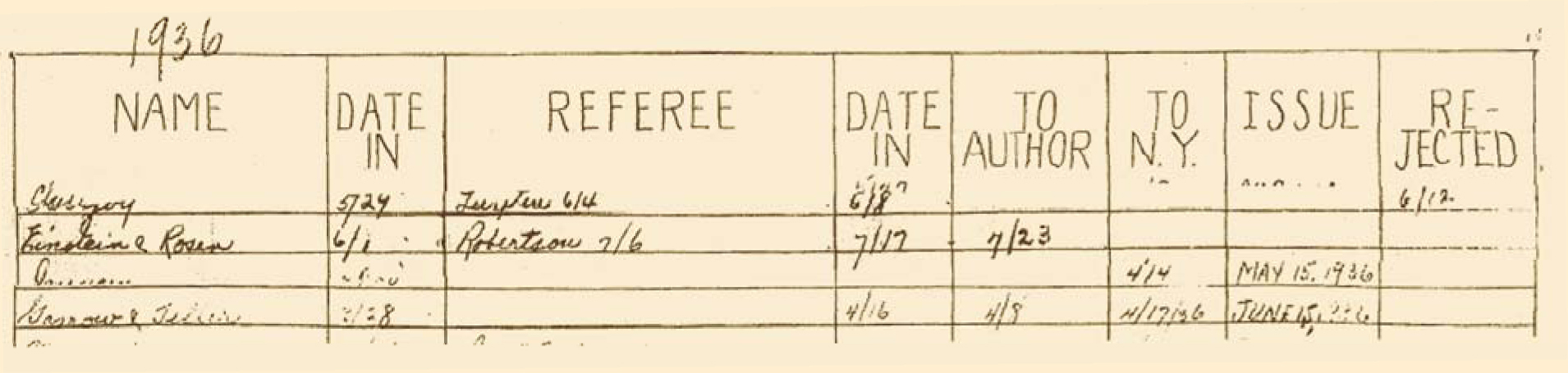 Figure 5. An early extract from the Physical Review logbook. The Einstein–Rosen article was received by the journal on 1 June 1936. After a delay of more than a month, John Tate sent a referral to Howard Percy Robertson on 6 July, finding him in Moscow, Idaho, on vacation after a sabbatical at Caltech. Robertson returned the manuscript and his review to Tate on 1 7 July. Six days later the package was sent back to Einstein.