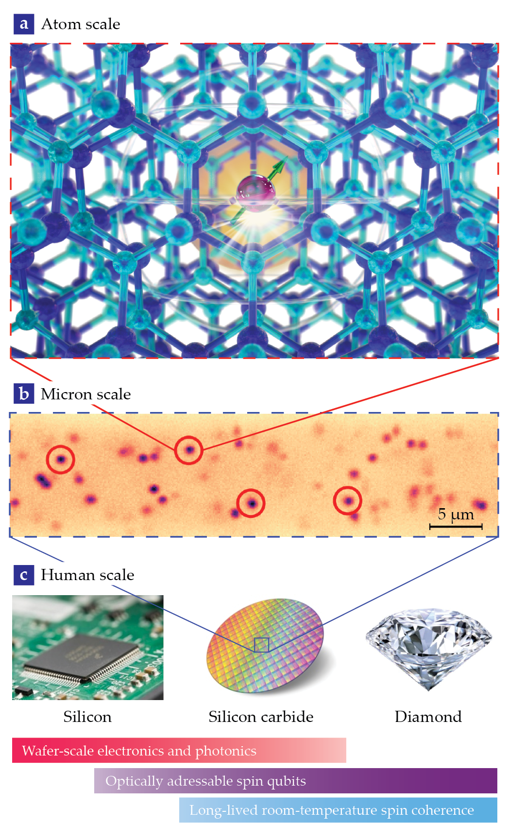 Where SiC really shines, however, is as a technologically mature, wafer-scale semiconductor; it is used for components in electric cars, 5G technologies, and LED light bulbs. Billion-dollar SiC fabrication facilities have opened in the past year that can produce wafer-scale, quantum-grade single-crystal materials. Besides clear cost and scalability advantages over diamond, SiC is also a much easier material from which to fabricate useful quantum devices. In fact, SiC is compatible with the same CMOS fabrication techniques that are used by the semiconductor industry to make today’s microchips. Quantum states in SiC can be readily integrated into the mechanical resonators found in a cell phone, into electrical devices to read out their quantum state in new ways, and into low-loss photonic circuits to create efficient entanglement, among other potential applications.