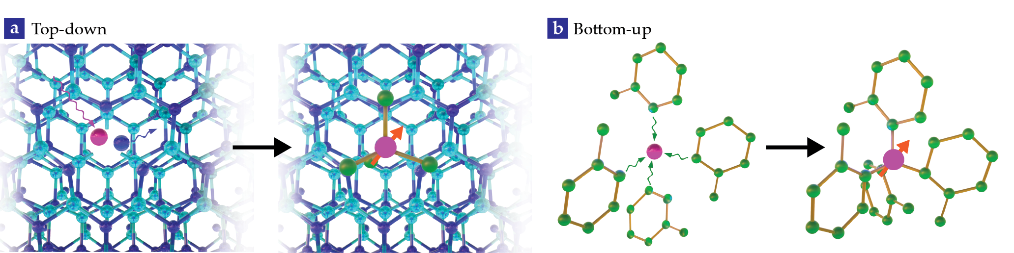 Creating defect spin qubits. (a) Most spin systems today are created with a “top-down” approach where impurities or vacancies are introduced into an existing structure. Here, an impurity (magenta) is introduced into a lattice, displacing an atom (blue) from a lattice site. The impurity and vacancy together can function as a qubit. (b) A “bottom-up” approach instead builds the entire structure atom by atom. Schematically, a central ion (purple) can be coordinated with specific chemical ligands (green) to create a structure with the desired behavior.