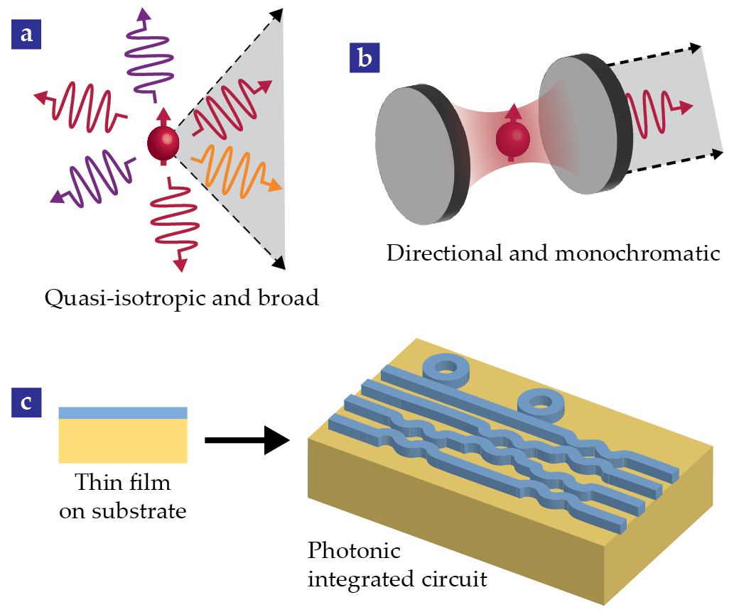 Photonically enhanced qubits. (a) In free space, defect-based single-photon sources tend to emit in many directions and have a wide spread of emission frequencies (different colors). Only a small fraction of the emitted light is collected (gray cone). (b) The emission behavior can be enhanced by integrating the source into an optical cavity, schematically displayed as two mirrors. Photon emission gets funneled into the cavity mode, dramatically decreasing the frequency spread and increasing the useful light collected. (c) Integrated photonic devices can be created by starting with a high-quality thin film of the desired qubit-hosting material (blue) bonded to a substrate (yellow) with lower index of refraction. The top layer can be patterned into photonic integrated circuits that contain the necessary components—cavities, beamsplitters, phase shifters, and so on—to perform quantum optics experiments on a chip.