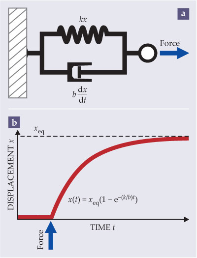 Although the details of how the cytoskeleton functions are complex, one way to think about its physical properties is in terms of a continuum, Kelvin–Voigt model—also known as the Voigt material—which lumps all of the biological complexity into a spring and a dashpot, shown in figure 1. That model captures the property that cells flow and deform on the scale of minutes and hours but are solid-like on the scale of seconds or shorter. It also illustrates how important both the magnitude and the loading rate of a force can be for dictating the cellular response. Our sense of touch provides an elegant, though still debated, example of the principle. Fingertips contain nerves that are optimized to sense vibrations at about 200 Hz, which allows one to pick up subtle features such as roughness by running a finger across a surface. In that context, the loading rate, rather than the load itself, is the important stimulus.