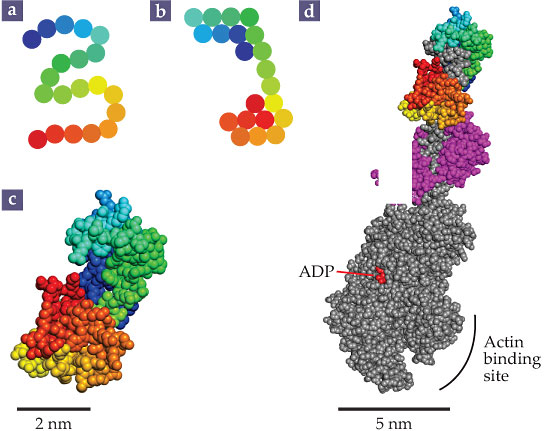 Figure 2. Protein folding in a nutshell. Proteins are polymers that consist of a defined sequence made from the 20 different amino acids encoded by DNA. (a) In this representative protein segment, each colored sphere represents one amino acid. (b) Weak and reversible interactions between specific amino acids cause the protein to fold into a well-defined three- dimensional shape that determines its function. (c) Protein folding can produce complicated structures. In this 3D, space-filling representation of a real protein, each sphere now represents an atom (excluding hydrogens); the colors correspond to different segments of the amino-acid chain, blue at one end progressing to red at the other. (d) The protein in panel c is one of three that form myosin, a protein assembly that binds to actin filaments and converts chemical energy from adenosine triphosphate into muscle contraction and adenosine diphosphate (ADP).13 Atoms in the main chain are colored gray. The two colored chains reinforce myosin’s lever arm, described in figure 3.
