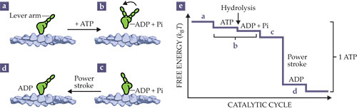 More specifically, it couples ATP hydrolysis to the swing of a lever arm by pulling on filaments of cellular actin. (See the article by Rob Phillips and Steve Quake, Physics Today, May 2006, page 38.) ATP turns out to be hydrolyzed while myosin is detached from the actin filament. Elegant experiments demonstrate that ATP hydrolysis is reversible within myosin’s active site, meaning that very little change in energy occurs while both adenosine diphosphate and a phosphate group, the products of the hydrolysis, remain bound at the active site. The stored energy is ultimately used in a power stroke—the pulling of the lever arm about 10 nm—that is triggered when myosin binds to actin and frees the phosphate, as outlined in figure 3.