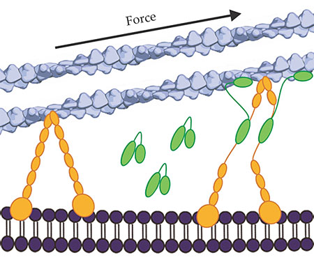 Many force-sensing proteins are likely present in focal adhesions, but the best understood are the proteins talin and vinculin, which link adhesion proteins to the cellular actin network. Biological and biophysical measurements support the model shown in figure 4: Mechanical stretch unfolds domains within talin, to which vinculin can bind to reinforce the connection between the cytoskeleton and focal adhesion.