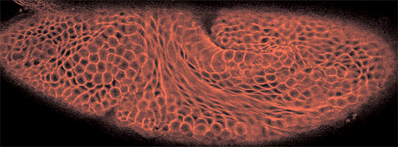 The image above, a still from a video of the development of a fruit-fly embryo, exemplifies the complex orchestration among hundreds of cells. Individual cells are squeezed, pushed, and pulled across significant distances to form different parts of the developing body.