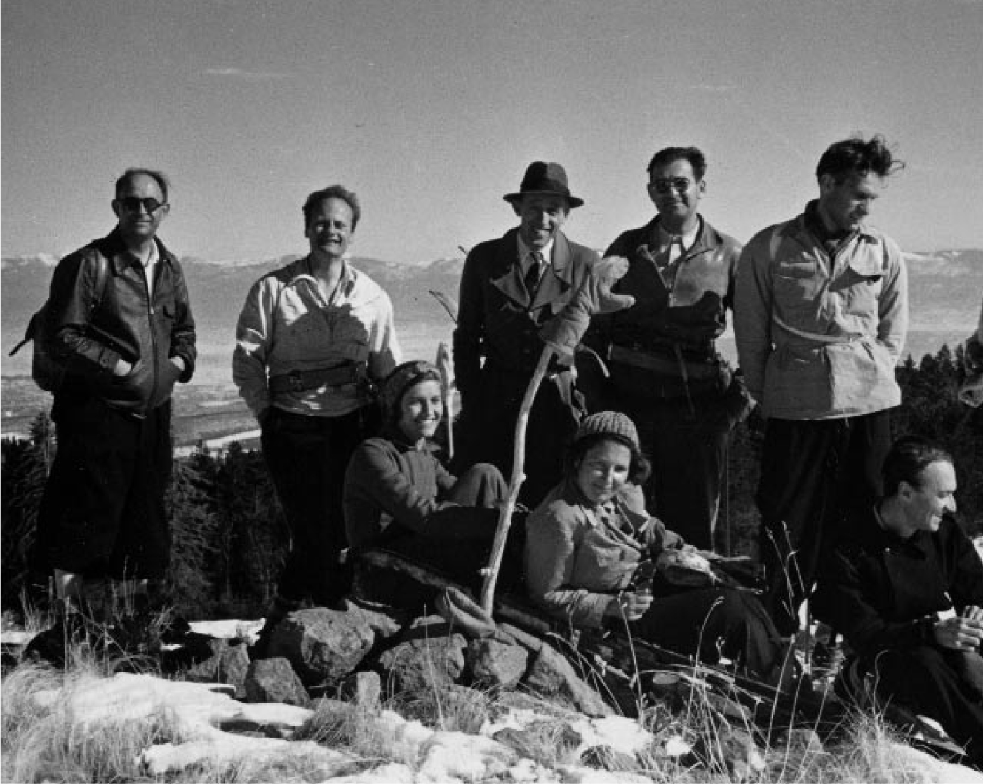 Figure 3. Near Los Alamos in 1944. Standing from left to right are Fermi, Hans Bethe, Hans Staub, Victor Weisskopf, and Julius Ashkin. Seated from left to right are Mrs. Staub, Elfriede Segrè, and Bruno Rossi.