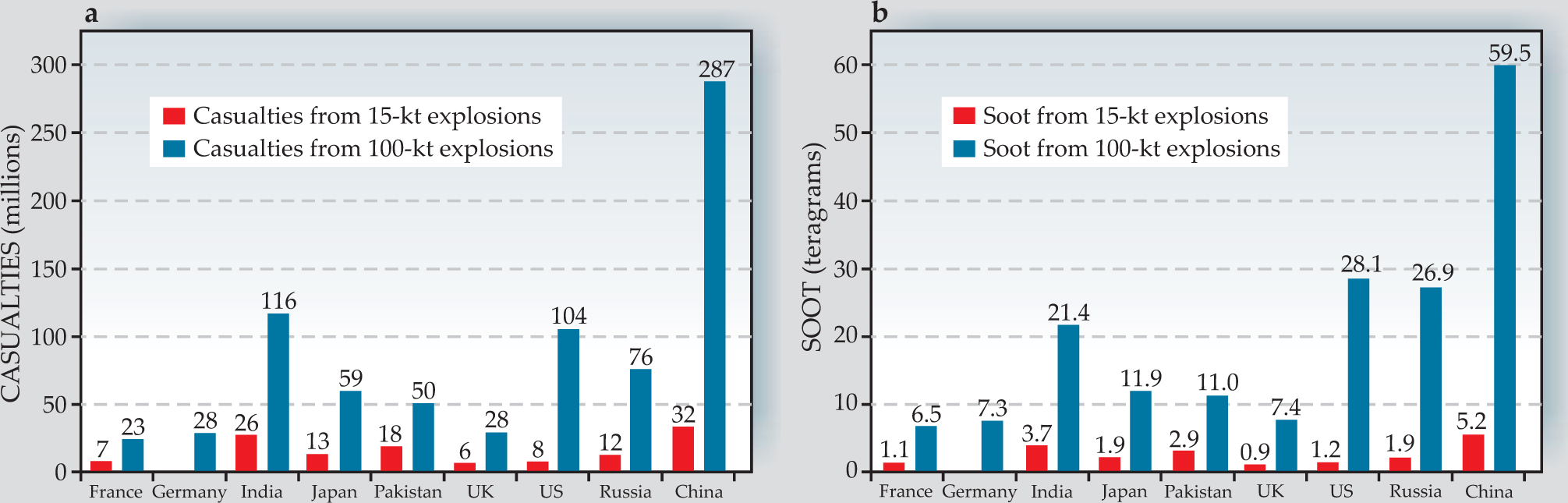 As figure 1 shows, a war between India and Pakistan in which each uses weapons with 0.75-Mt total yield could lead to about 44 million casualties and produce about 6.6 trillion grams (Tg) of soot. A SORT conflict with 4400 nuclear explosions and 440-Mt total yield would generate 770 million casualties and 180 Tg of soot. The SORT scenario numbers are lower limits inasmuch as we assumed 100-kt weapons; the average SORT yield would actually be larger. The results can be relatively insensitive to the distribution of weapons strikes on different countries because attacks on lower-population areas produce decreased amounts of soot. For instance, 100 weapons targeted each on France and Belgium leads to about the same amount of soot as 200 on France alone. On the other hand, using fewer weapons on densely populated regions such as in India and China would reduce soot generation.