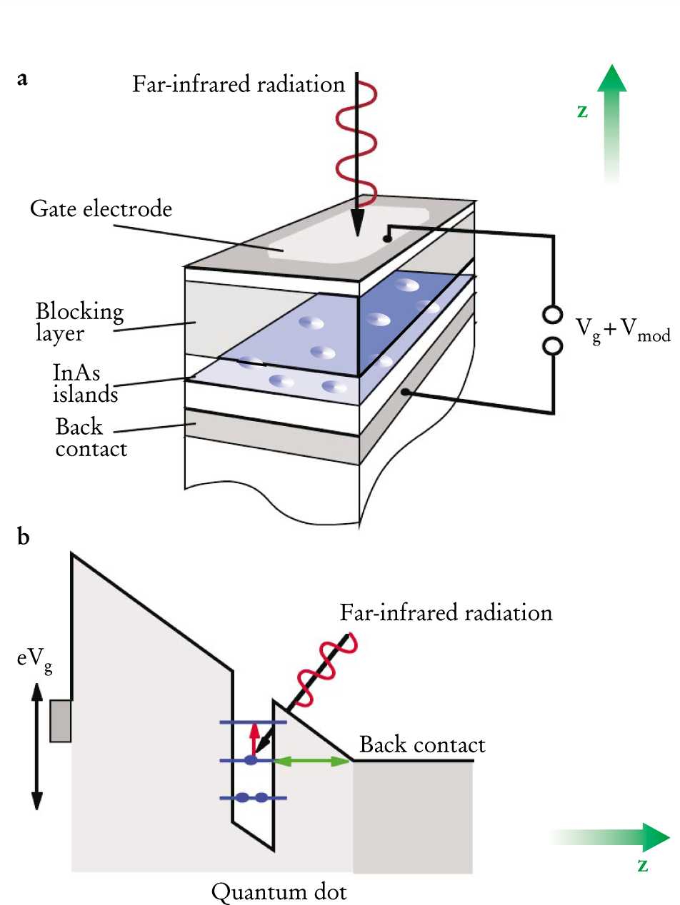 Figure 2. Quantum-dot field-effect device used to probe the electronic states of self-assembled quantum dots and quantum rings. (a) The device consists of a capacitor-like structure between two parallel conducting plates; the self-assembled islands are embedded, as indicated, in an internal layer. The lower plate (back contact) is part of the grown semiconductor structure and consists of a highly (silicon) doped GaAs layer. The top plate is a thin, transparent, metal layer evaporated on top of the sample. The field inside the capacitor structure, and thus the energetic alignment between the islands and the back contact, can be tuned by an external voltage Vg applied between the back contact and the top gate. Because the back contact is located only some tens of nanometers away from the islands, electrons can readily tunnel back and forth between the two if an electronic level in the islands is aligned with the chemical potential of the back contact. When a small AC voltage Vmod is added to Vg, the resulting shift of charge back and forth between the back contact and the dots will manifest itself by an increased capacitive signal in the external circuit, which can be used for capacitance spectroscopy. (b) A schematic conduction band diagram shows that electrons enter the quantum dots by tunneling from the back gate through the GaAs barrier (the triangular section above the double-headed green arrow). The allowed dipole transitions of the many-particle system are measured using infrared spectroscopy, as indicated: The lower energy level is populated from the back contact using an applied bias (green arrows), then an incident infrared photon induces a transition between two quantum dot energy levels (red arrow), and the transition energy is measured by infrared absorption spectroscopy.