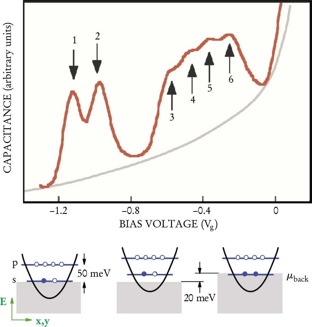 The capacitance-voltage characteristic of quantum dot samples typically manifests six maxima, as shown in figure 3, where the indicated maxima denote the loading of one through six electrons into the dot. The charging peaks are grouped according to the internal shell structure in the dots, which is indicated at the bottom of figure 3. The first two electrons fill the lowest, spin-degenerate state, the so-called s shell. The fact that the next shell consists of four roughly equally spaced maxima is a direct consequence of the shape of the confining potential, with symmetry in the xy plane and much stronger confinement along the growth direction z because of the oblate shape of the self-assembled islands. It turns out that many electronic properties of quantum dots can be well accounted for by assuming parabolic confinement in the xy plane.