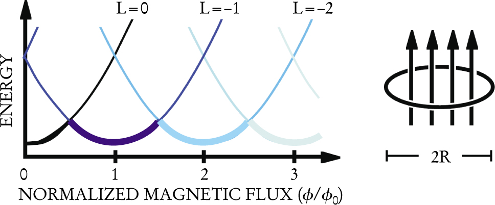 Figure 4. Quantum-ring energy states are a function of the external magnetic field because the magnetic flux penetrates the ring, as shown at right. Periodic boundary conditions make the energy states a function of an integer L; whereas for quantum dots the ground state always has L = 0, for quantum rings with a nonzero magnetic field the ground state could have nonzero L values. Plotted at left is the calculated energy of a simple model of a quantum ring for several L values as a function of the flux through the ring normalized to the flux quantum φ0 = h/e; the ground state as a function of flux is indicated by the heavy line.