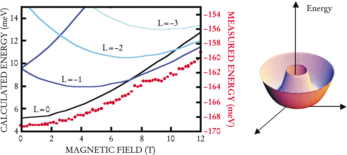 Figure 5. Electron energy levels for a magnetized quantum ring are plotted as a function of magnetic field. The solid lines plot computed energies for an idealized ring using parameters (width, radius) that were estimated from far-infrared spectroscopy of actual rings. The different lines are parametrized by the integer L, which is related to the angular momentum of the state. The ground-state energy at a given magnetic field is the minimum energy of any of the colored lines; note the change in ground state from the L = 0 to the L = −1 line at 8 tesla. The red dots (plotted with the right-axis scale) give the measured energy of the level, based on the positions of the lowest charging maximum in the capacitance. The illustration at right shows the shape of the confining potential used in the calculation.
