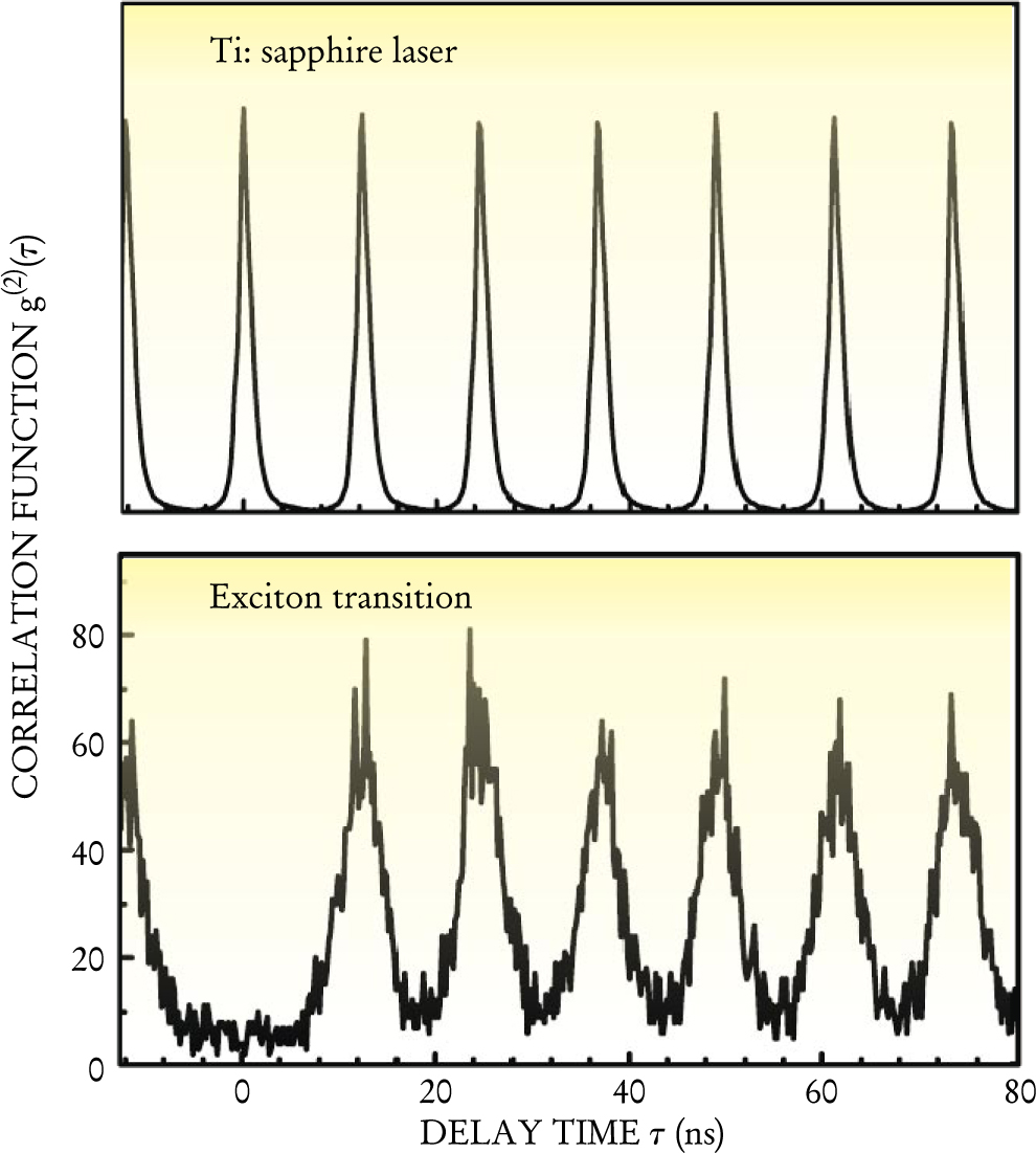 Figure 6. Intensity correlation function for a quantum-dot single-photon source based on pulsed laser excitation of a single quantum dot embedded in a microdisk. Plotted are the correlation function for the titanium-sapphire excitation laser (top) and quantum-dot ground-state emission under excitation conditions (bottom), as a function of the time delay τ between the photon arrival times (see the box on page 51). The absence of a peak at τ = 0 in the emission correlation function shows that none of the pulses contains more than one photon.