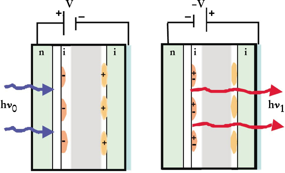 When the stored information is to be read, the exciton can be reassembled by using an applied electric field to drive the hole into the quantum dot that contains the stored electron. Monitoring the light output from the device as a function of storage time gives a measure of the charge storage capability. Charge storage times of up to 10 s have been measured, which are remarkably long when compared to the exciton lifetime in a quantum dot of about 5 ns.