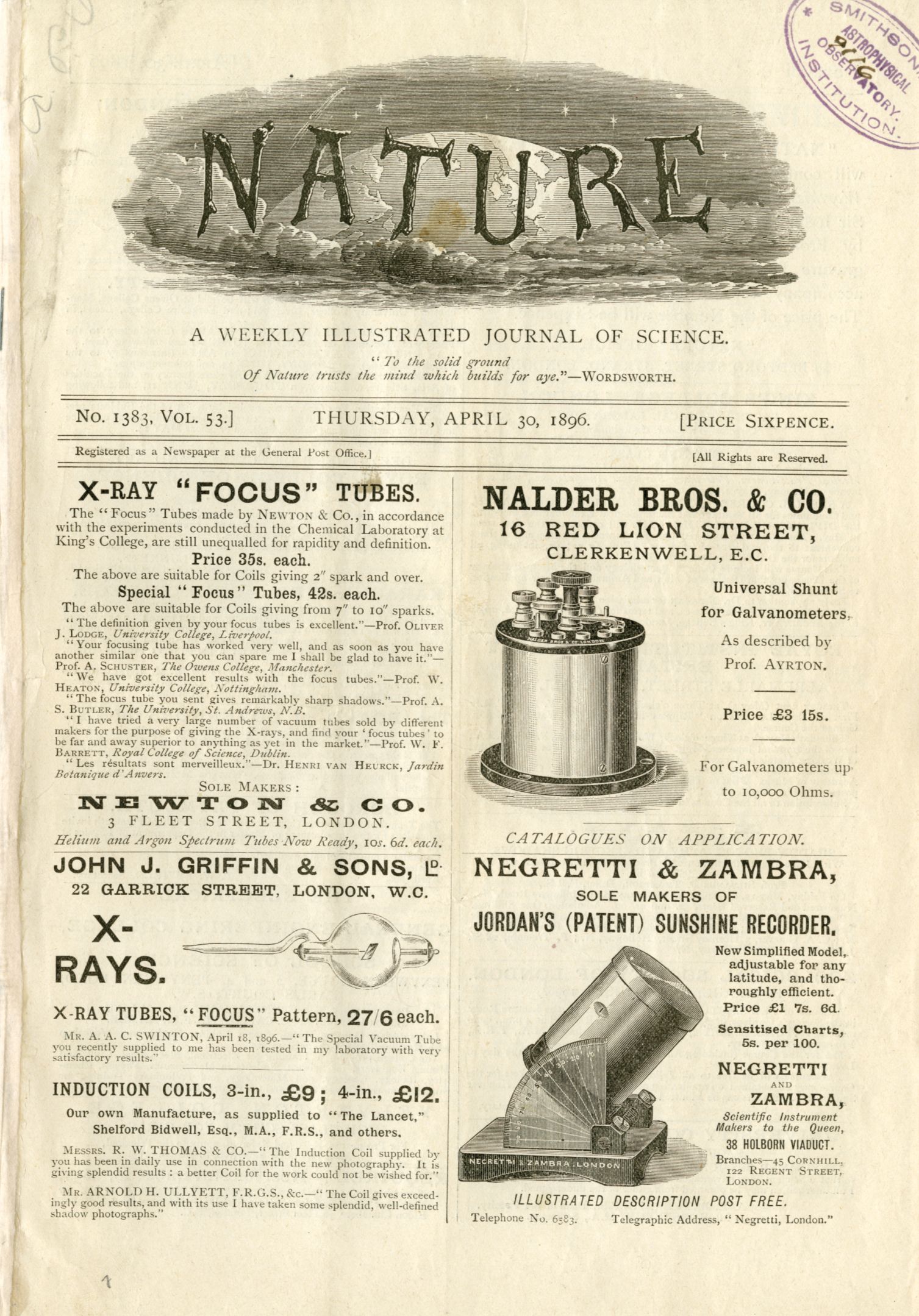 Title page of an issue of Nature from 1896, during the age of early radioactivity research. (Courtesy of the Wenner Collection, AIP Niels Bohr Library and Archives.)