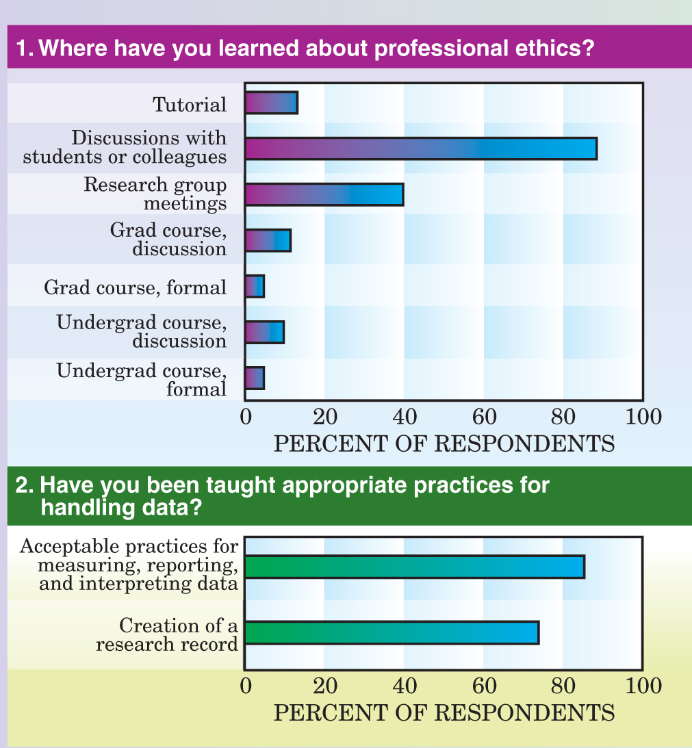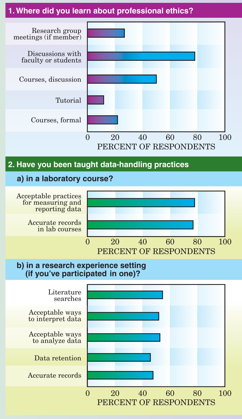 It appears that norms of professional conduct assumed to be familiar and practiced by all are, in fact, not universally understood. Our operating definition of “professional ethics” is outlined in box 3. The surveys of undergraduates, junior APS members, and department chairs sought to examine how professional standards are taught and learned. The survey responses paint a consistent picture. As illustrated in figures 2–4, all three groups report that scientific ethics education is largely informal; much of it occurs in discussion among colleagues. Proper data handling and record keeping are mostly, but not universally, taught in laboratory classes. Not all research groups make a serious effort to teach students how to record data properly and keep a research record.