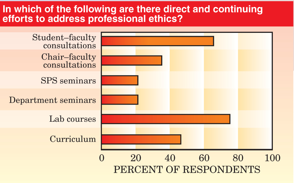 A much larger issue is the task force’s recommendation with regard to ethics education. When asked what APS could do to help in ethics training and education, the junior members gave many interesting responses. Several said that anything APS did to bring ethics issues before the community for discussion would be welcome—certainly better than “the silence that exists now” among physics faculties. “APS publications,” wrote one respondent, “should have more stories on ethics issues to keep the much needed discussions going.” Another suggested that it would be useful to have “published standards from APS sent to all members in the form of a booklet.” Others suggested that ethics workshops be held at APS meetings and that APS maintain a website listing resource materials on scientific ethics.