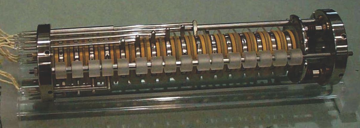 Figure 1. Electrostatic forces generated by this apparatus work in concert with a magnetic field to create a Penning trap. Researchers at NIST will use the device to trap and count the protons emitted from a collimated beam of decaying neutrons. By simultaneously monitoring the flux of neutrons through the trap, the researchers should be able to measure the neutron lifetime to within 0.1% accuracy. (Photo courtesy of Geoffrey Greene.)