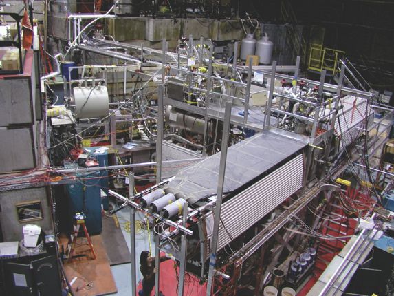 Figure 2. The spectrometer seen extending from the foreground to the upper right of this picture is situated on an ultracold-neutron beamline at Los Alamos National Laboratory, where it’s being used to measure parity violation in neutron decay. Before entering the spectrometer, the neutrons are cooled using solid deuterium and polarized by a large magnetic field. (Photo courtesy of Adam Holley.)