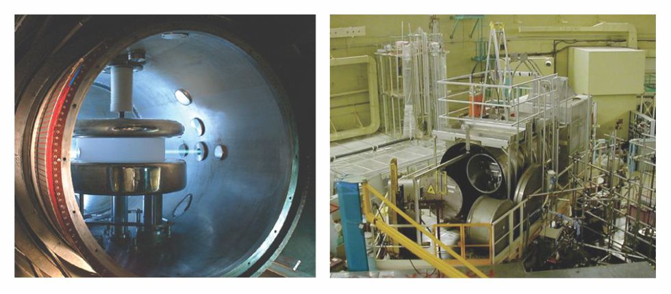 Figure 3. The magnetic resonance measurement device shown at left detects tiny shifts in the precession frequency of polarized ultracold neutrons due to changes in an applied electric field. Protected by the several layers of magnetic shielding visible at right, it was used by researchers at the Institut Laue–Langevin to set an upper bound of well below 10−25 e-cm on the neutron electric dipole moment. It has now been improved and moved to a new ultracold neutron source at the Paul Scherrer Institute in Switzerland, where it promises even greater precision. (Photos courtesy of the EDM Collaboration.)
