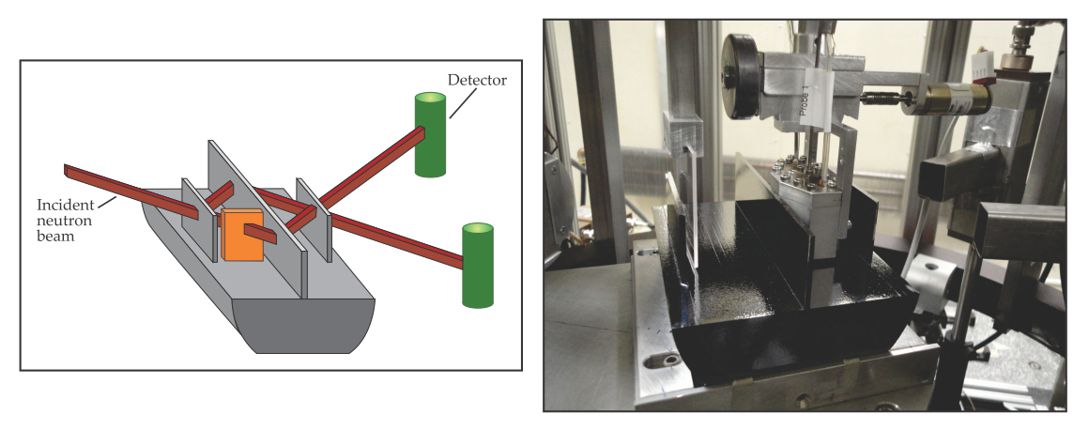 Figure 4. The neutron interferometer illustrated at left and pictured at right comprises three parallel blades carved from a single silicon crystal. Roughly 10 cm wide, it’s used by NIST researchers to coherently split and recombine incident beams of slow neutrons. By rotating the interferometer about the incident-beam axis, one can detect a subtle gravitational phase shift that stems from the slight difference in height of the interferometer paths. Similarly, by detecting the phase shift that arises when a test sample (orange in the illustration) is placed in one of the interferometer paths, one can precisely determine the sample’s neutron scattering amplitude. To achieve a high signal-to-noise ratio, the interferometer must be protected by multiple thermal and vibrational isolation enclosures. (Photo courtesy of Muhammad Arif.)