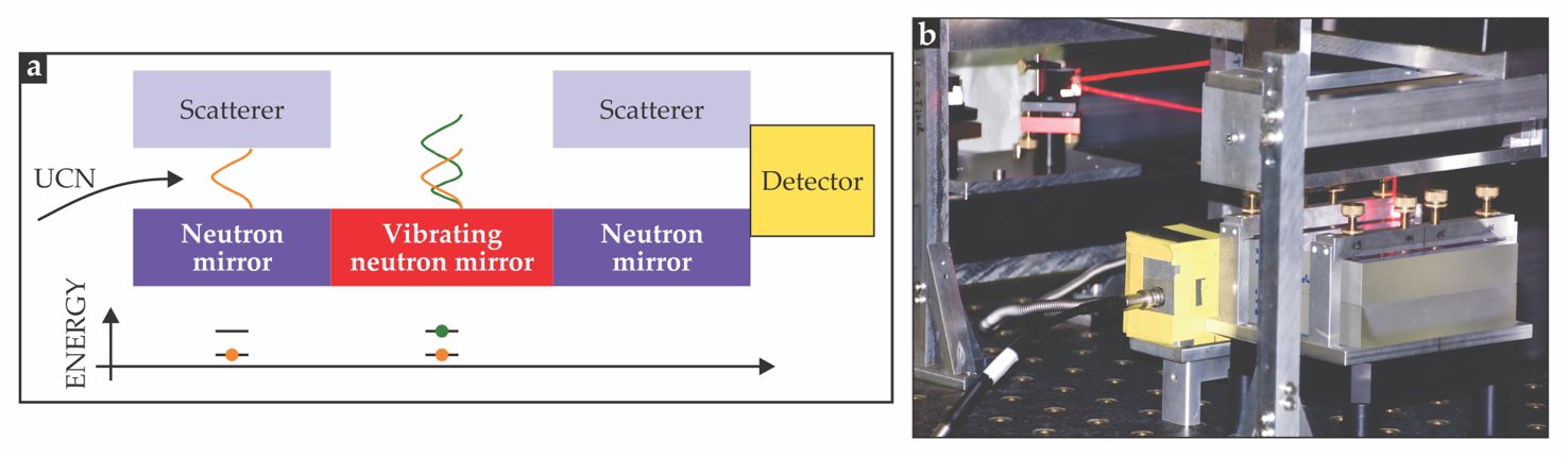 Figure 5. Quantum transitions of ultracold neutrons (UCNs) between gravitational bound states can be orchestrated by passing a horizontal beam of neutrons between narrowly spaced mirrors. (a) In Earth’s gravitational field, the UCNs hover above a mirror at a height that depends on its quantized energy. If a scatterer is placed at an appropriate height above the mirror, only neutrons in the lowest gravitationally bound state, whose vertical spatial probability distribution is indicated here by the orange curve, are transmitted. A vibrating mirror tuned to a transition resonance can then send the neutrons into a superposition of the ground state and an excited state (green). A second scatterer ensures that only the ground state will be counted by the detector. (b) Shown here is the actual apparatus used at the Institut Laue–Langevin. (Photo courtesy of and illustration adapted from Hartmut Abele.)