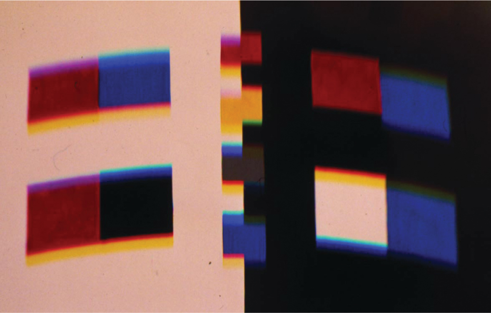 The synthetic stage of Goethe’s investigation is illustrated by his experiments on the colored fringes that appear when gray and colored images on various backgrounds are viewed through a prism. Figure 3 shows how part of one of Goethe’s diagrams (see the cover of this issue), from Theory of Colors, looks through a prism with its refracting angle held downward. Experiments with squares in different shades of gray against white and black backgrounds showed that the intensity of the colored fringes increased with the lightness contrast at the boundary. More complex phenomena were seen using colored squares, which exhibited fringes with new colors not seen in the previous experiments. Goethe argued, quite plausibly, that those new colors were due to the mixing of the elementary fringe colors with the colors of the squares themselves. Goethe regarded that mixing as the true explanation of Newton’s observation that a red square, viewed through a prism against a black background, appears displaced slightly higher than a blue one, as seen in the upper right of figure 3. Whereas Newton had adduced this observation to prove that different colors of light have different refrangibilities—the first proposition of his Opticks—Goethe saw it as merely a special case of the more general law of colored fringes.
