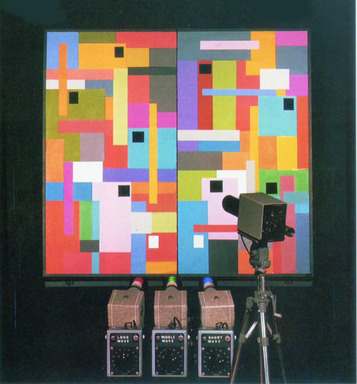 Mondrian-like Collages were key elements of Edwin Land’s experiments on color vision. The Mondrians were illuminated by the three projectors at the bottom with light comprising various proportions of short, medium, and long wavelengths. A telephotometer, seen on a tripod to the right, measured the wavelength composition of the light reflected from a given colored patch to the eye. Land thereby showed that the perceived color of the patch is not determined by the wavelength composition of the light reflected from it.