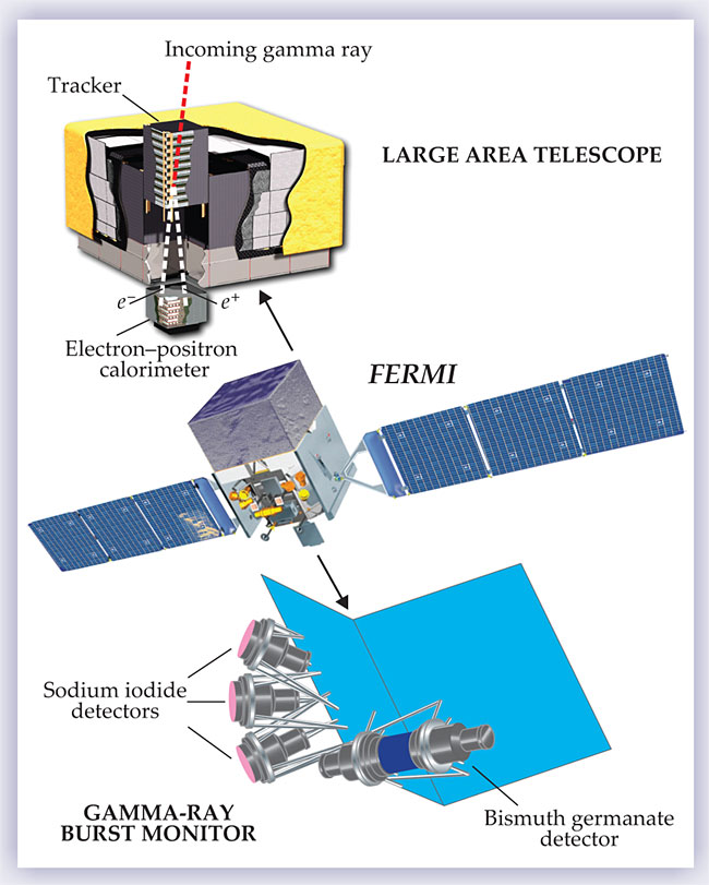 Figure 1. The Fermi Gamma-Ray Space Telescope and its two scientific instruments.11 With its silicon-strip tracker and electron–positron calorimeter, the Large Area Telescope measures arrival directions and energies of photons with energies from 20 MeV to more than 300 GeV. The smaller Gamma-Ray Burst Monitor, with its array of 14 crystal gamma-ray detectors, is primarily designed to detect low-energy transient gamma-ray outbursts at photon energies from 8 keV to 40 MeV.