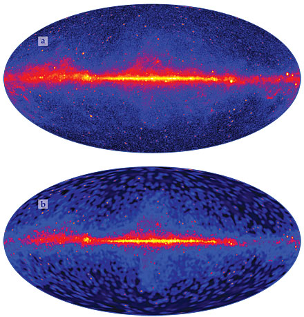 Figure 2. Brightness of the gamma-ray sky mapped over four years by the Fermi orbiter’s Large Area Telescope for all photon energies (a) above 1 GeV and (b) above 10 GeV. The maps are in galactic coordinates. The bright equatorial strip is the Milky Way’s disk seen edge on, centered on the galactic center. The pointlike sources at high galactic latitudes are mostly active galaxies beyond ours, while bright points nearer the galactic equator are mostly associated with pulsars and supernova remnants in the Milky Way. The diffuse “Fermi bubbles” more prominent in panel b create the pale dumbbell-shaped feature that extends about 50° north and south from the vicinity of the galactic center. They may result from a relatively recent episode of unusual activity near the Milky Way’s central black hole. (Figure courtesy of the Fermi LAT collaboration.)