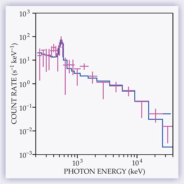 Figure 3. A terrestrial gamma-ray flash recorded by Fermi’s Gamma-Ray Burst Monitor on 13 August 2009. The spectrum exhibits the 511-keV annihilation line resulting from positrons interacting with the material of the satellite. The blue curve is a model fit that takes account of the burst monitor’s instrumental resolution. (Adapted from ref. 7.)