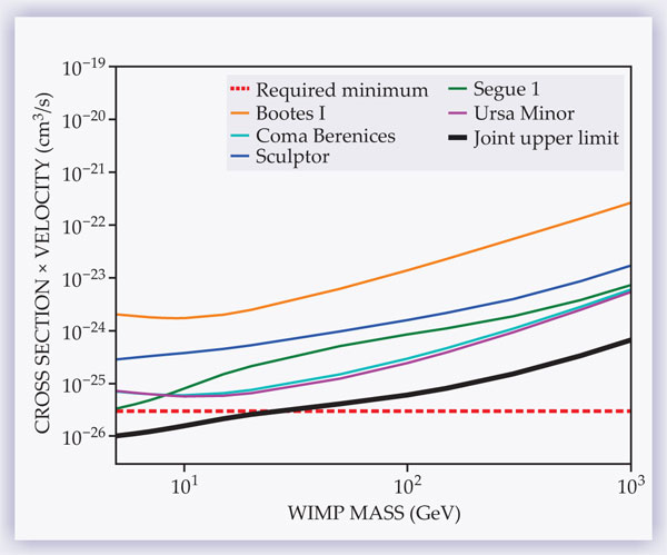 Figure 5. Upper limits (at 95% confidence) on the product of annihilation cross section and mean collision velocity for WIMPs, as yet undiscovered weakly interacting massive particles thought to be responsible for most of the dark matter in the cosmos. The joint limit as a function of WIMP mass comes from null results of Fermi gamma-ray observations of 10 nearby dwarf galaxies. Colored curves show individual upper limits from five of them. The red line at 3 × 10−26 cm3/s represents the minimum required if WIMPs are to account for the presumed mean density of nonbaryonic dark matter in the cosmos. (Adapted from ref. 9.)