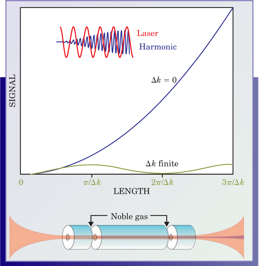 Anne L’Huillier from the Center of Studies in Saclay and coworkers realized the effect of such phase matching on the emission characteristics of the high-harmonic light in the early 1990s. Appreciating that such phase matching was actually engineerable took longer. Conventional nonlinear optics generally makes use of the birefringent properties of crystals to eliminate the phase mismatch between the laser and harmonic beams. However, HHG is implemented most often in a gas, to avoid absorption of the light by a solid.