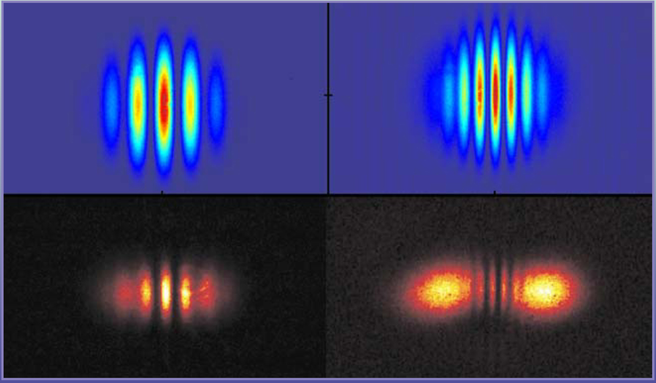 Figure 2. A waveguide geometry allows the buildup of a highly coherent extreme-UV spatial mode that is highly focusable and useful for coherent imaging. Consider the fringe visibility as measured in a Young’s double pinhole experiment. The data shown here demonstrate the highest intrinsic spatial coherence values in a laserlike beam ever measured at such short wavelengths.13 The interferograms were created by 1-mm EUV beams centered at photon energies of 31 eV (top) and 95 eV (bottom) and diffracted by pinhole pairs at separations of 150 µm (left) and 250 µm (right).