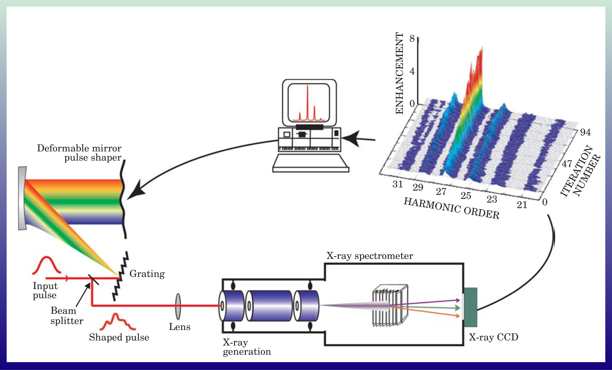 Figure 3. Quantum control of attosecond dynamics. An evolutionary algorithm, shown schematically, tests different pulse shapes from a deformable mirror for their ability to produce a single target harmonic order. The algorithm then selects and optimizes the pulse shape that best does the job. The optimized laser pulse shape helps guarantee that, with a precision of about 10 attoseconds, the attosecond x-ray bursts constructively interfere in building up the high-harmonic signal.