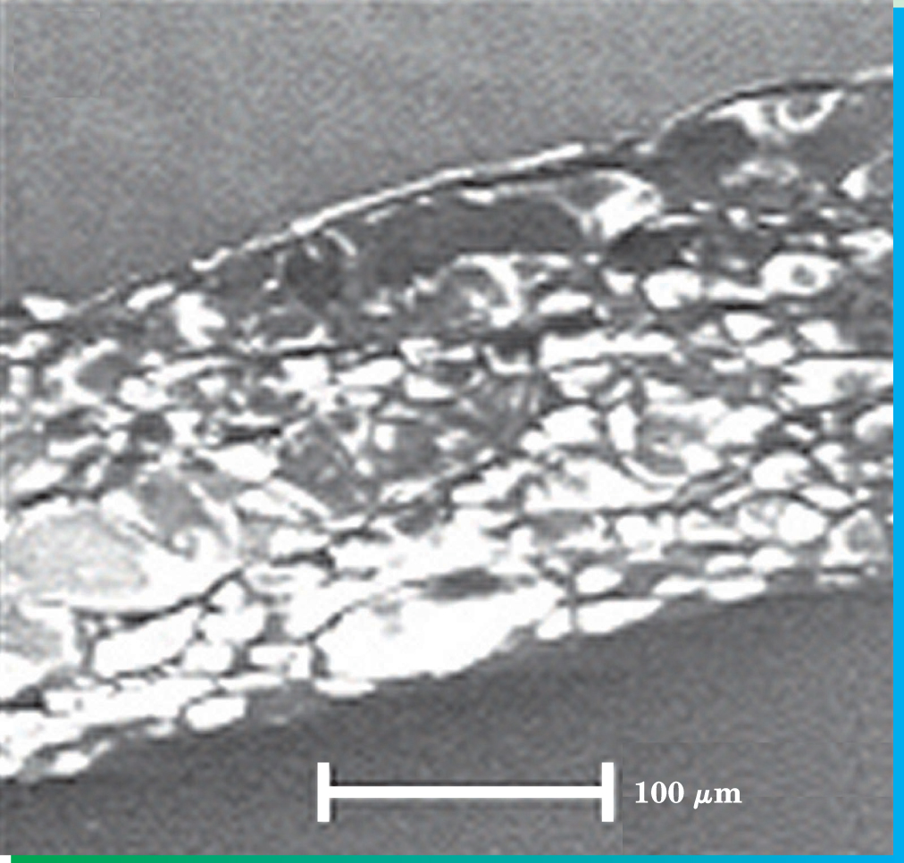 Figure 2. Direct evidence of internal charges in a charged cellular polymer film. The bright areas show secondary electron emission in a cross section that is cut at an angle of a few degrees to the surface.