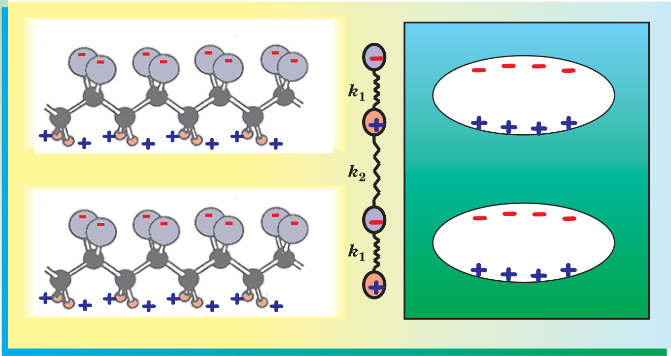 Figure 3. Charge separation in piezoelectrics. The scale of the charge displacement is much smaller in polymeric or ionic ferroelectrics (left) than it is in ferroelectrets (right). A spring schematic (center) illustrates coupling forces inside and between the dipoles.