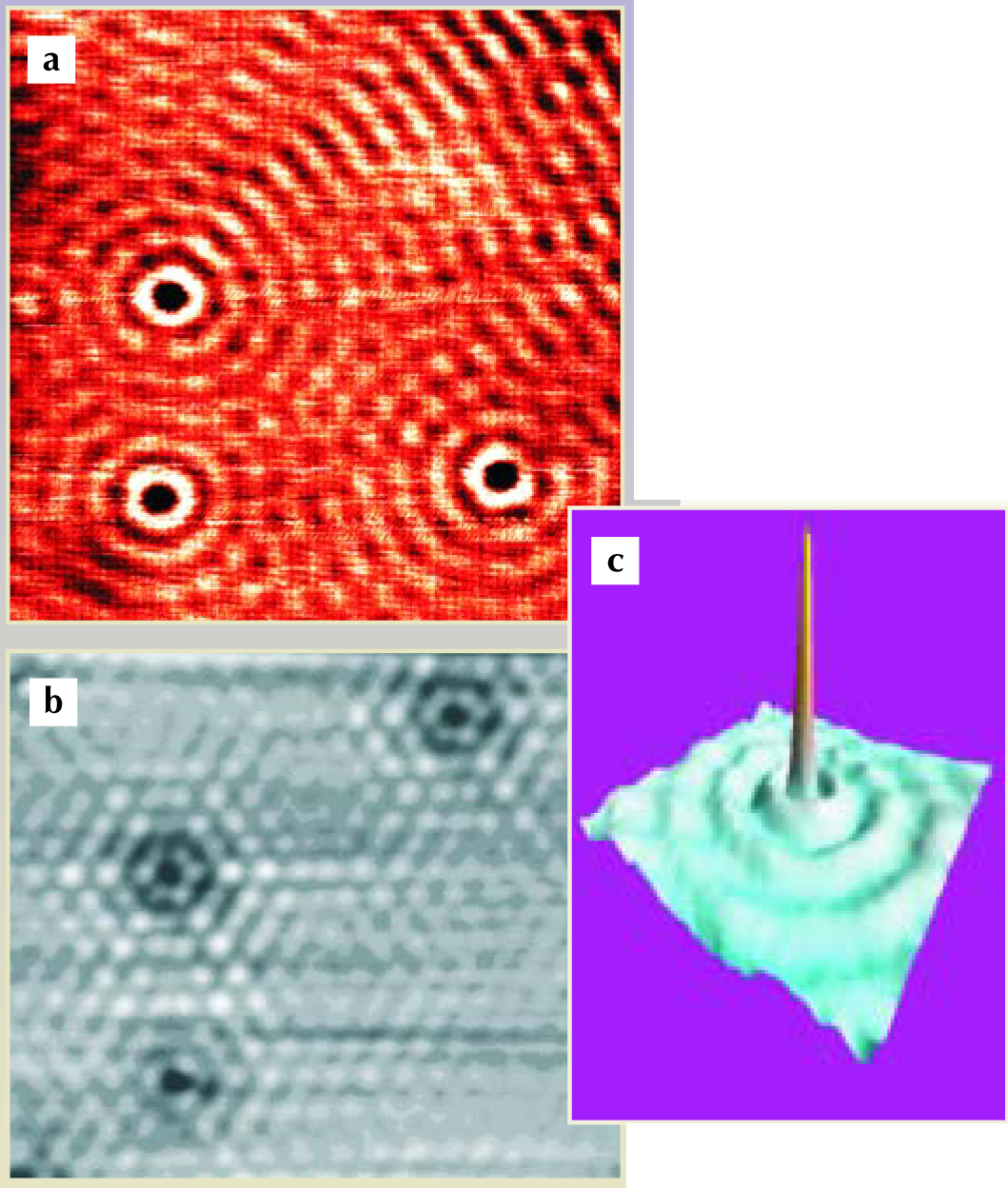 Figure 2. A scanning tunneling microscope (STM) image is a map of the electronic density of states of the surface. (a) Electrons scattered by three impurity atoms, imaged as dark depressions, produce wave-interference patterns on the copper(111) surface. (b) A monolayer of lead is grown over a 1 × 1 surface of silicon(111). As imaged by an STM, the atoms rearrange to form a hexagonal ringlike corrugation because of indirect electronic interactions between lead atoms. (c) A three-dimensional perspective of the interference pattern formed around a cerium impurity on the (111) surface of silver. The rippled topography matches what is expected from a many-electron solution to the Schrödinger wave equation for the atomic configuration.