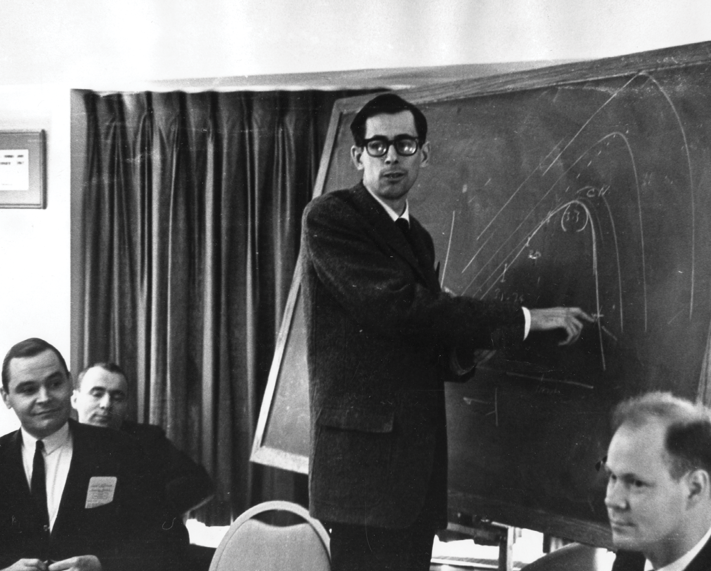 A young James Peebles lectures at a blackboard in an undated photo. (Courtesy of Mitchell Valentine, AIP Emilio Segrè Visual Archives, Physics Today Collection.)