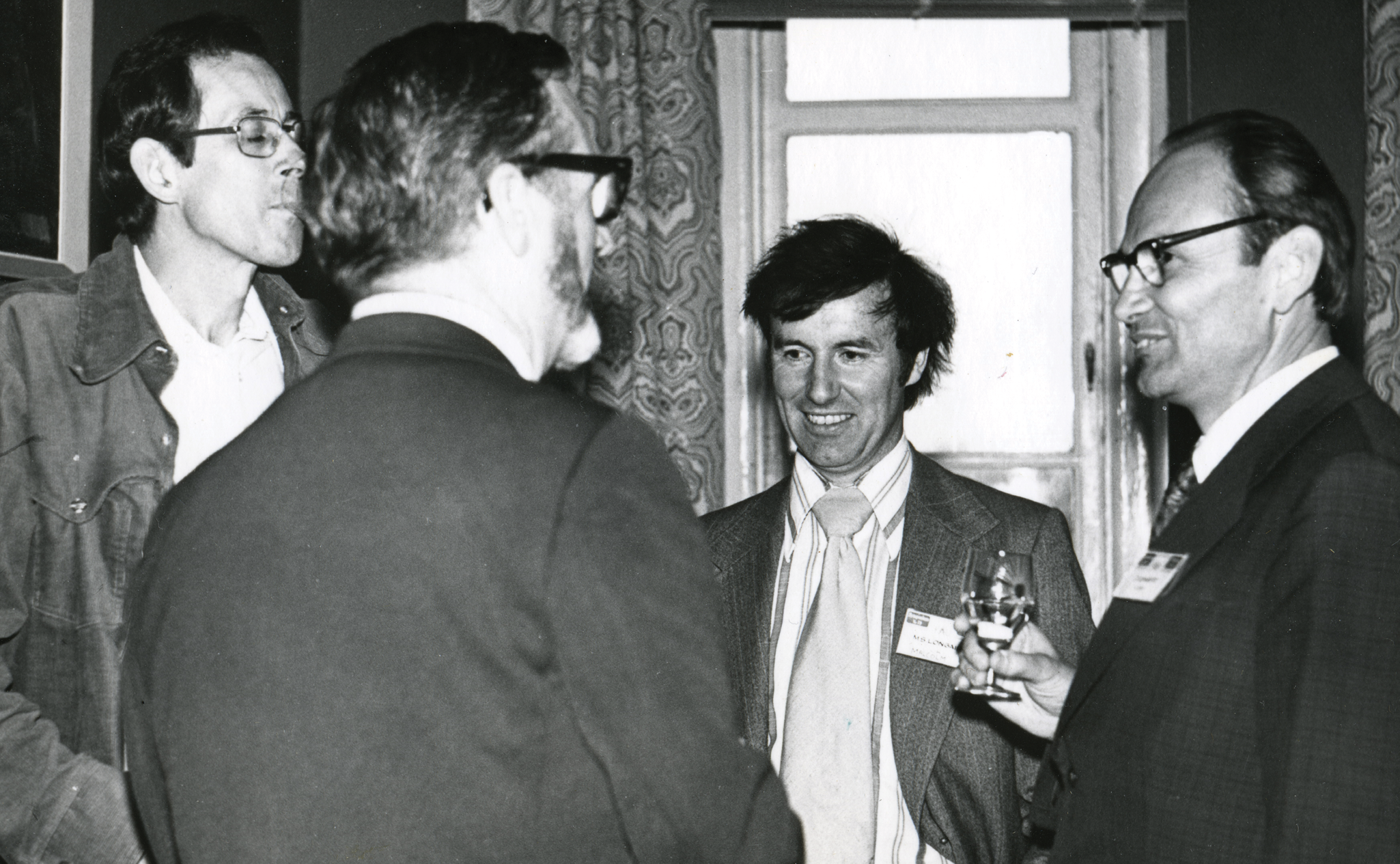 James Peebles (far left) and Jaan Einasto (far right) converse with George Abell (second from left) and Malcolm Longair (second from right) at an International Astronomical Union symposium in 1977. (Courtesy of Jaan Einasto.)