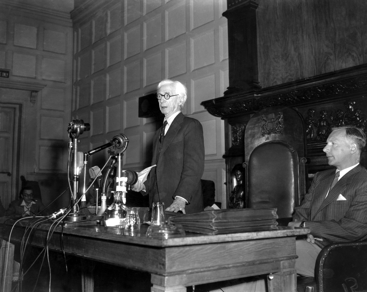 Bertrand Russell issued on 9 July 1955 the Russell–Einstein Manifesto, which highlighted the dangers of nuclear weapons. The document was cosigned by several prominent scientists, including Frédéric Joliot-Curie, who had proposed the appeal to Russell. (Photo from the Smith Archive/Alamy Stock Photo.)