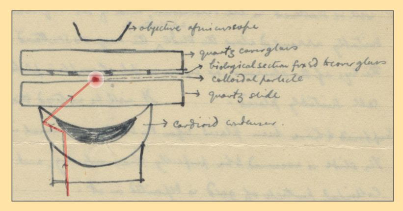 Figure 1. In an April 1928 sketch sent to Albert Einstein, Edward Hutchinson Synge proposed a new microscopy method: using a tiny gold particle (red) between two quartz slides to scatter incident light from below onto a sample. Light that didn’t strike the particle would be totally internally reflected, and an objective lens of a microscope could be positioned to accept some of the gold-scattered light. That arrangement, Synge wrote, could be used to image a biological specimen fixed to the top cover slip at a resolution below the diffraction limit. (Courtesy of the Albert Einstein Archives, Hebrew University of Jerusalem, Israel.)