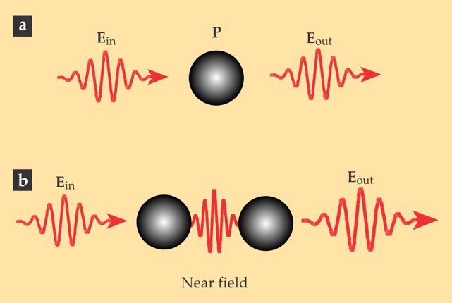 Intriguingly, Synge’s particle can be viewed not simply as a light scatterer but as an optical antenna, a mesoscopic structure that efficiently converts the energy of incident optical radiation into localized energy or vice versa, depending on whether the antenna is configured as a receiver or a transmitter. The connections between near-field optics and antenna theory are the focus of many ongoing studies, as we’ll see later.