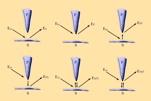 where ES and EP are fields emitted or scattered from sample and probe, respectively; ESP is the field scattered by the sample and then emitted by the probe; EPS, in turn, describes the reverse̵—the field scattered by the probe and emitted by the sample. Additional interactions contribute as higher-order terms in the series.