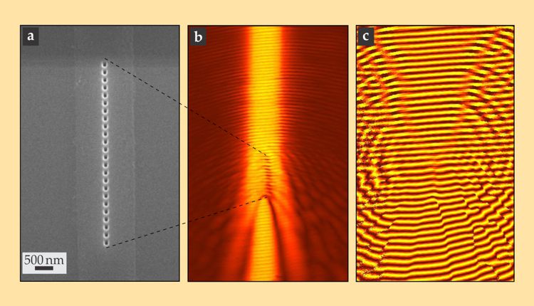 Figure 4. Light injected into a ridge waveguide containing a linear series of holes, shown here as an electron micrograph (a), propagates along the guide as an electromagnetic mode that scatters during each encounter with a hole. An aperture probe can be used to locally pick up the field distribution of the scattered light just above the waveguide. Using heterodyne near-field microscopy, researchers from the University of Twente interfered that signal with a frequency-shifted reference signal to image the scattered light’s amplitude (b) and phase (c) as a function of position. (Adapted from ref. 5.)