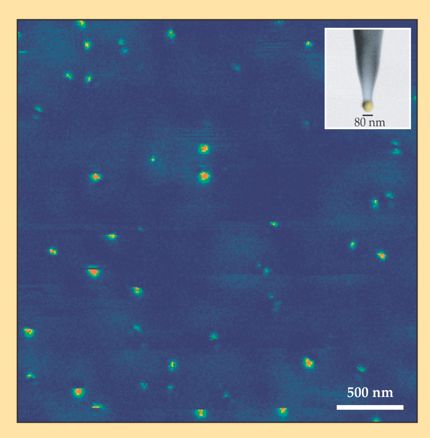Figure 5. Single molecules on a surface. The local field near a laser-irradiated gold nanoparticle (inset) is used to excite a sample of fluorescent molecules. The single-molecule fluorescence intensities in the scanned image represent the gold particle’s local field distribution. (Courtesy of Shawn Divitt, Institute of Optics, University of Rochester.)