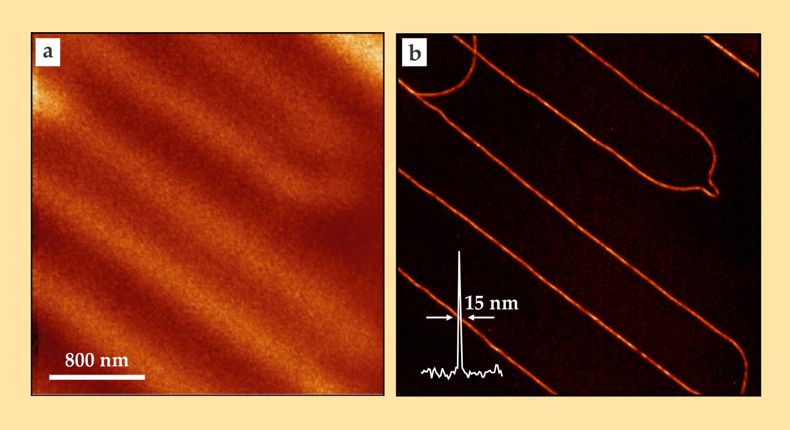 Figure 6. Single-wall carbon nanotubes, imaged (a) by confocal Raman microscopy and (b) by tip-enhanced Raman scattering (TERS). In both cases, image contrast comes from the intensity of the Raman G band at ν = 1580 cm−1, a carbon–carbon stretching vibrational mode. The superior signal-to-noise ratio and resolution of TERS stems from using near-field light from a sharp gold tip scanning close to the nanotube sample to locally enhance Raman scattering. (Adapted from ref. 17.)