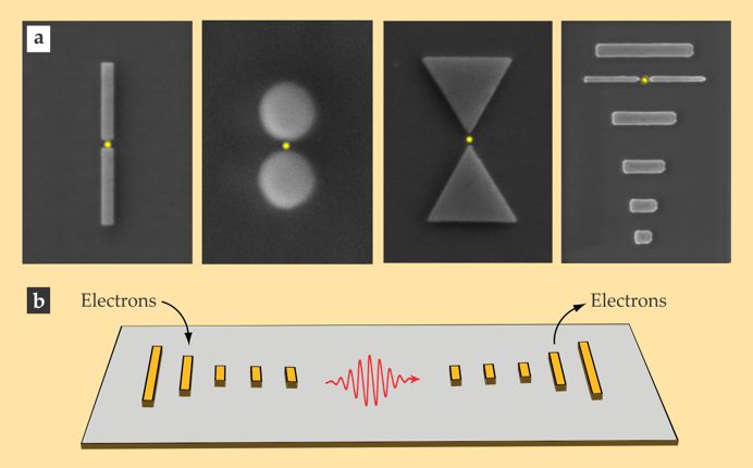 Figure 7. (a) Scanning electron micrographs of various optical antennas: a gap antenna that radiates as an effective linear dipole; a Hertzian dimer antenna,18 which provides superior radiation efficiency; a bow-tie antenna, whose geometry provides broadband reception or transmission; and a Yagi–Uda antenna, which yields a highly directional signal due to the interplay between the different elements. In each case the antenna (gray) either couples incident light onto, or efficiently reradiates energy out of, a molecular receiver or transmitter (yellow). (b) An antenna can also be configured as an optical interconnect, in this case performing transduction between electrical current and optical radiation.