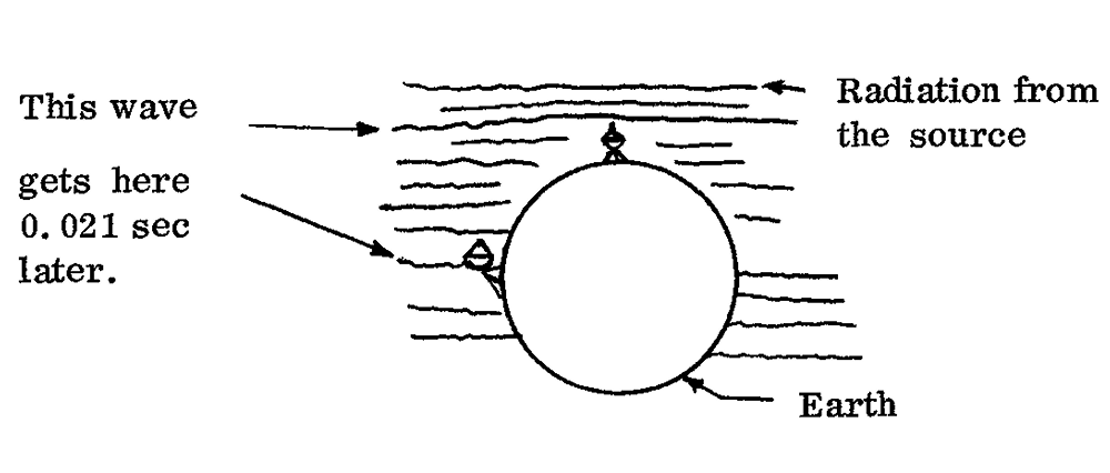 A schematic diagram illustrating the principles of very long baseline interferometry. A wave approaches Earth and is measured by two radio telescopes at different locations. To combine the measurements, astronomers need to know the precise time at which each observation was taken. (Image from J. Broderick, “VLB Interferometry,” The Observer, January 1970, p. 7.)